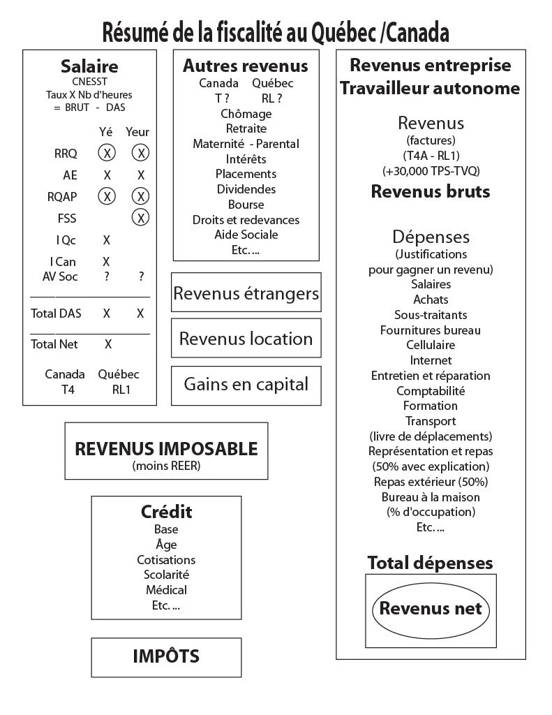 Vous trouverez ci-joint un aide mémoire complémentaire à la vidéo explicative. Toutes les informations évoquées se retrouvent ici sous forme de schéma pour aider votre compréhension de la structure fiscale Québécoise et Canadienne.